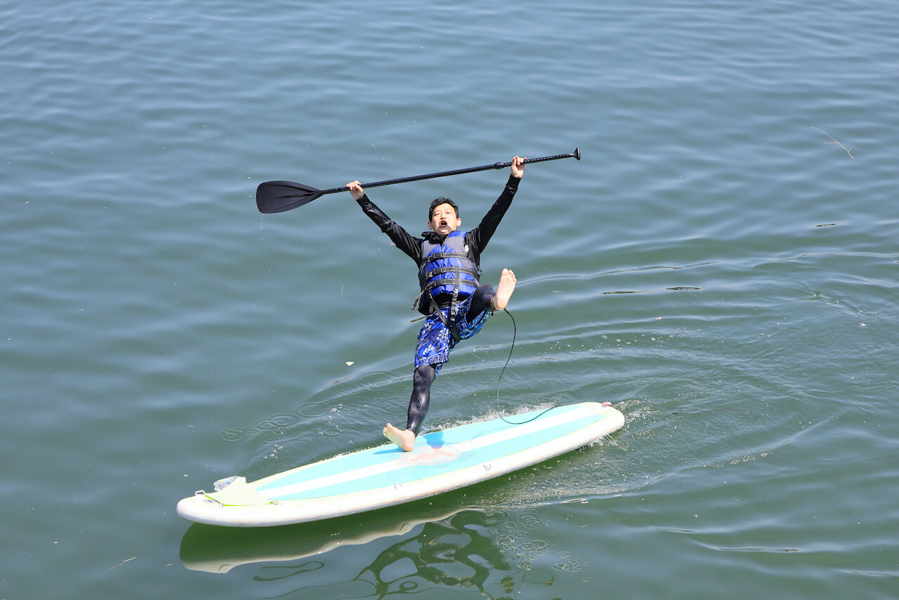 専用のボードは一般的なサーフボードよりも大きめで浮力が高く、実際に乗ってみると思ったよりも安定感があります。「初めてだから乗れないかも」「自分は運動神経があまりよくない」…そんな人でも安心を。最初は座った状態からなのでバランスも比較的とりやすく、そのままカヌーのように楽しんでもSUPの醍醐味は十分に味わえます。インストラクターが丁寧に乗り方や漕ぎ方を教えてくれ、小さな子供や女性、初心者でも10~15分ほど練習すればボードに立てる人が多いといいます。