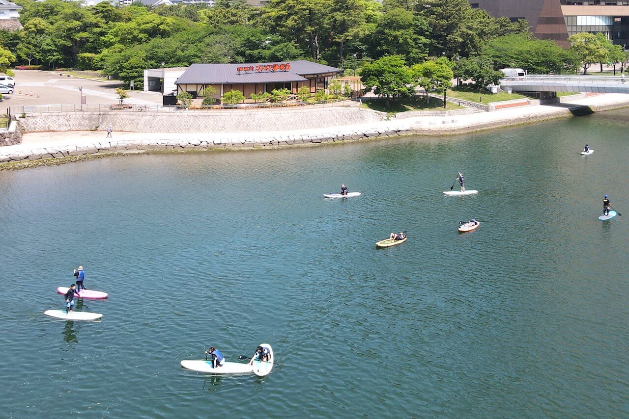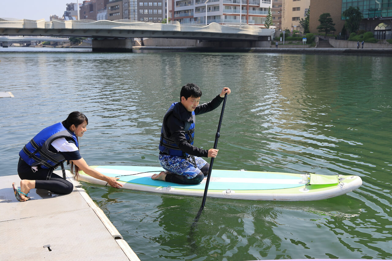 この日参加した人たちも全員なんなくボードに立つことができました。水上に立つと、浮遊感や爽快感、ほどよい緊張感が入り混じって思わず気分が高揚します。最初はちゃんと立てるか不安もありましたが、思っていたよりもずっと簡単。SUPが性別・年齢問わずに親しまれている理由を実感できました。また海とは違って、紫川は波がなく穏やかという点も初心者にやさしいポイントです。