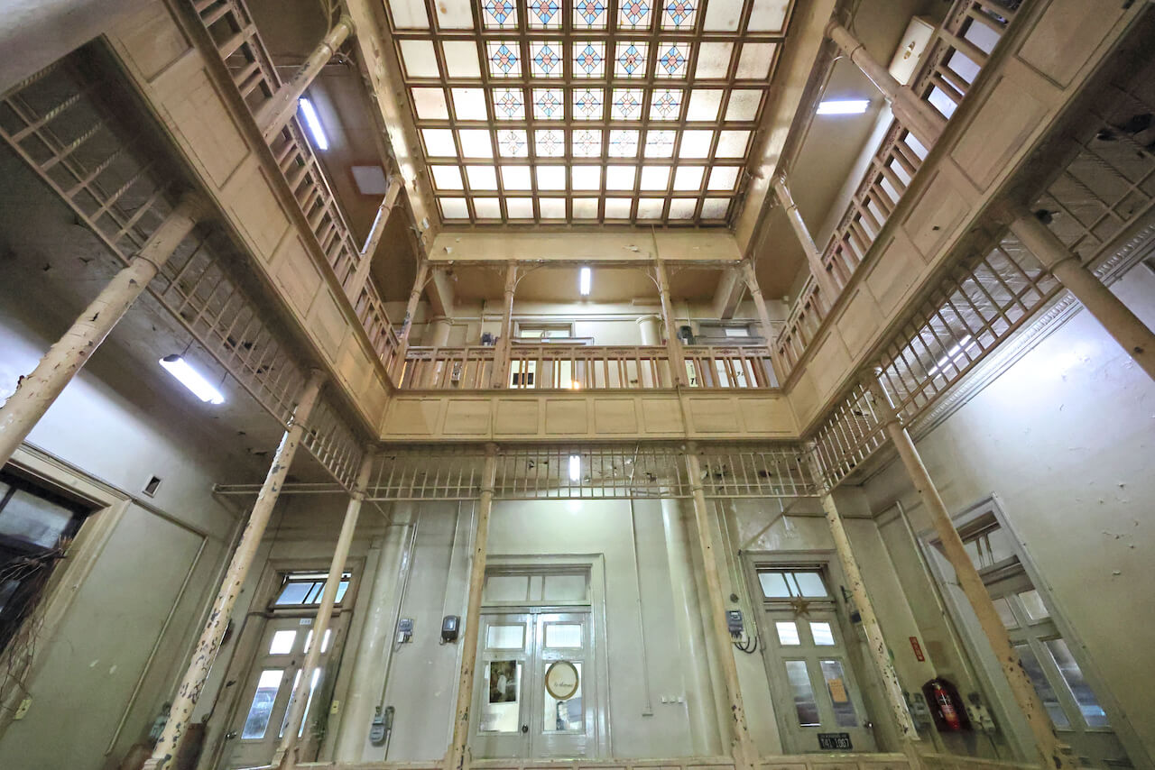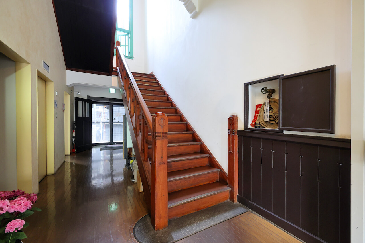 レンガ造り3階建ての本館は、補修が施されていない壁部分や窓まわりに当初のデザインが残されています。さらに必見なのは、中央部に吹き抜けの回廊を配したビルの内部。装飾付きの手摺、ステンドグラスを用いた天井など随所に豪華な意匠が散りばめられ、歴史を踏みしめるように階段を上がると、大正時代にタイムトリップしたかのような気持ちに包まれます。現在は上野海運株式会社がこのビルを所有しており、1階は上野海運株式会社の事務所、2~3階にはカフェやデザイン事務所などがテナントとして入居しています。