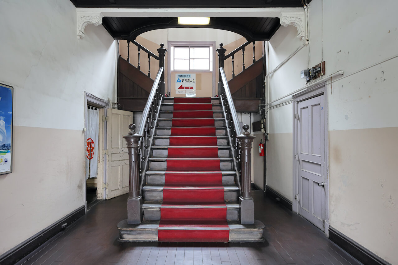 外観は竣工当時とは変わっているものの、木造2階建ての建物は石造り風の意匠でさすがの重厚感。小さなポーチを持つ玄関を中心に左右対称の形をしているのが特徴です。内部も当時は豪華な造りとなっており、会議室は組合員以外公私の会合に利用され、石炭関係者の社交場、クラブ、迎賓館として公会堂のような役割も果たしていたそうです。建物内部の見学はできませんが、玄関からは当時の面影を残す階段室を見ることができます。