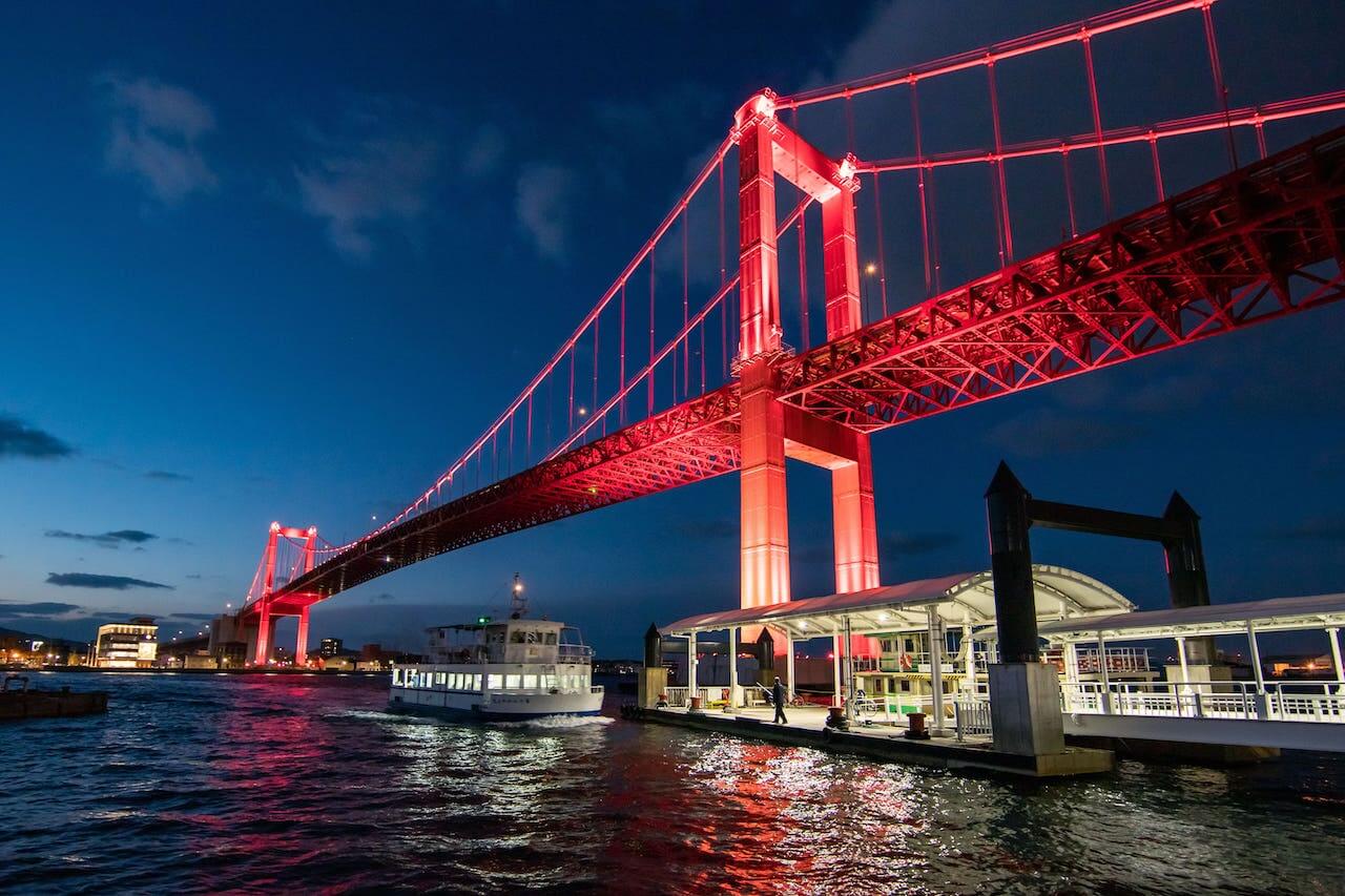 洞海湾に架かる、壮大で鮮やかな赤いつり橋。若松区と戸畑区を結ぶ若戸大橋は、2022年に開通60周年を迎えます。同年2月、日本の長大つり橋の技術的原点として、歴史的、技術的見地から重要であるとの評価から、国の重要文化財に指定されたことは記憶にも新しいでしょう。