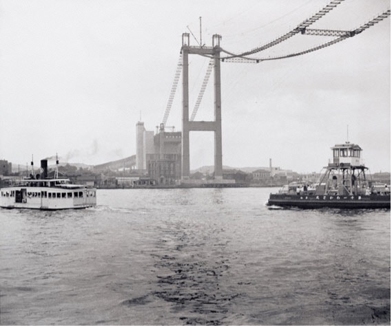 若戸大橋ができる前は、若松・戸畑間を直接つなぐ交通手段は船しかありませんでした。船以外の交通手段、すなわち橋やトンネルを求める機運が高まったのは、1930(昭和5)年に起こった渡し船の転覆事故がきっかけ。戦争で一旦は頓挫したものの、その後の高度経済成長期に車の利用が大幅に増えたことでさらに必要性が高まり、若戸大橋の建設は始まりました。