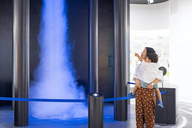 北九州市の産業の歴史を知ることができる「キタキューをカガクする」や防災についての知識が広がる「災害をカガクする」、そして同館の目玉として人気の大型竜巻発生装置を備えるのは1Fフロア。竜巻発生装置はボタンを押すと、轟音と共に水蒸気が渦を巻き高さ約10mにまで上昇!LEDライトが照射され、竜巻が赤や緑、青などカラフルに色を変えていきます。