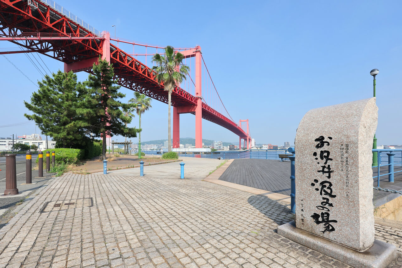 「若戸渡船」戸畑渡場付近は、洞海湾に架かる若戸大橋を望むダイナミックな景色が魅力です。特におすすめのフォトスポットは、「お汐井汲みの場」辺りから望む洞海湾と若戸大橋。橋のたもと、大橋公園そばにある「お汐井汲みの場」は、ユネスコ無形文化遺産「戸畑祇園大山笠」の「お汐井汲み」が行われる場所です。