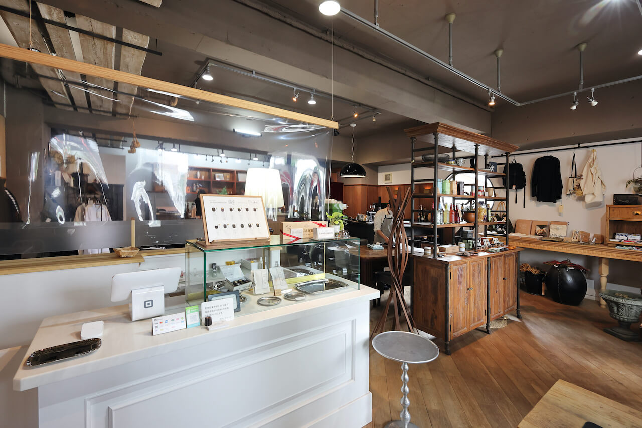 店内に入ると、そこは店主のこだわりと感性が詰まった寛ぎ空間。洋服や食器、調味料などが並ぶ店の一角にはバーカウンターが設えてあり、香り高いコーヒーを味わうこともできます。もともと洋服のセレクトショップとカフェが一体となった「TIGERMILK BOUTIQUE SUITES」という店であり、その中にカヌレの「ダグリダ」が併設する形となっています。