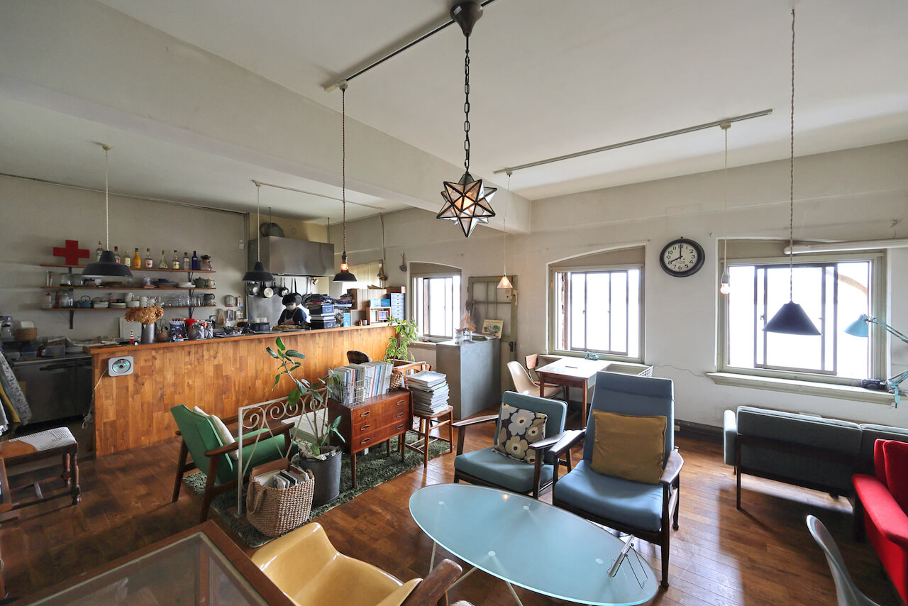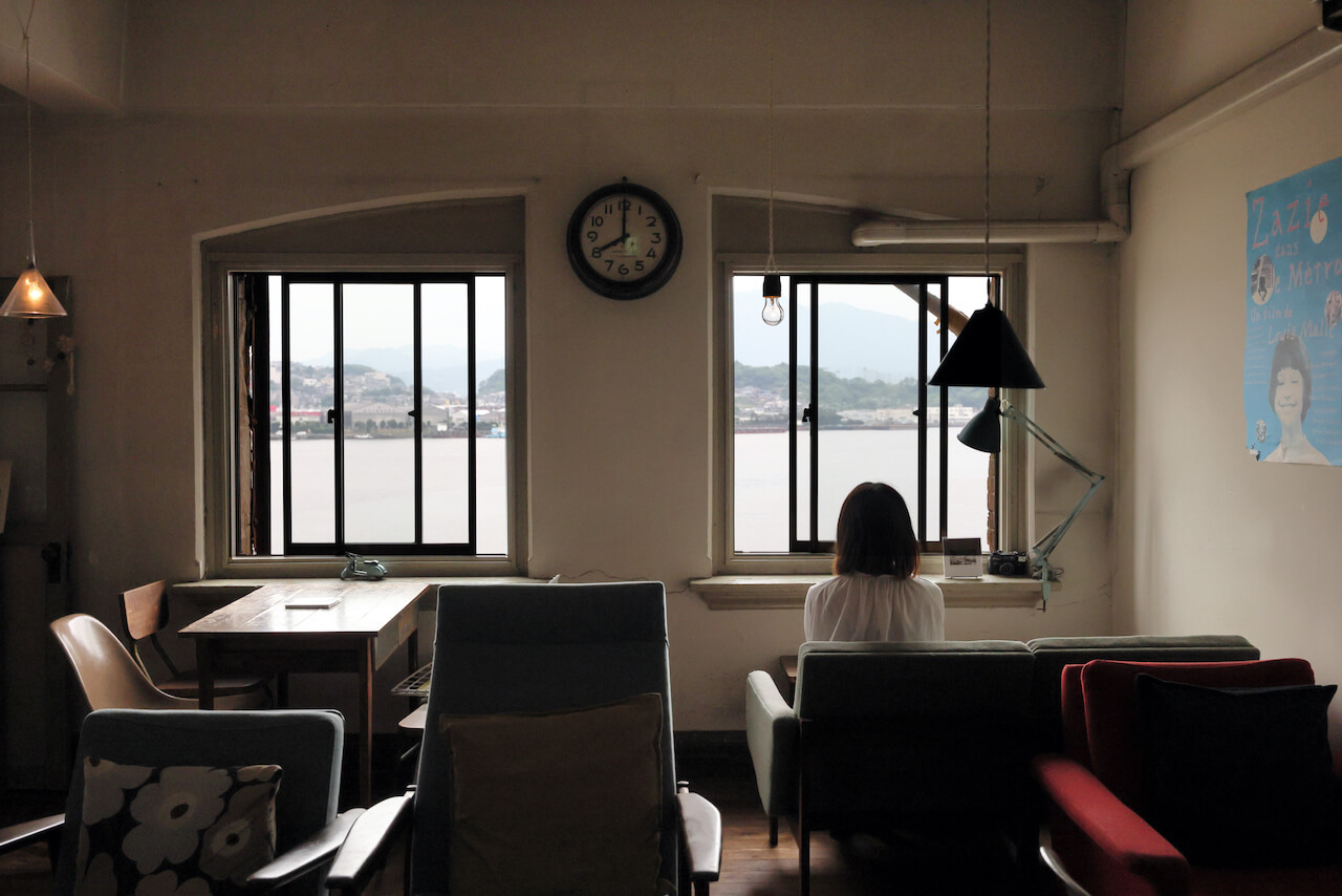 「ここの雰囲気と景色が気に入って決めたんです」とこの場所にカフェを開いた理由を話すのは、店主の山本朝子さん。その言葉通り、ビルの3階にある店は窓から洞海湾を一望できる絶好のロケーション。店内に配されたテーブルやソファ、照明、アンティーク雑貨などのセレクトもこの「上野ビル」の雰囲気と見事に調和しています。