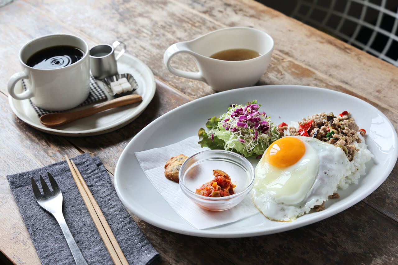 ランチタイムは、8種から選べる手作りのプレートランチが味わえます。「そぼろのバジル炒めごはんプレート」や「ロコモコ丼プレート」などがあり、スープとドリンク(平日のみ)が付き¥850。手作りのケーキ付きなら¥1150。フードは15時以降アラカルトでのオーダーとなります。