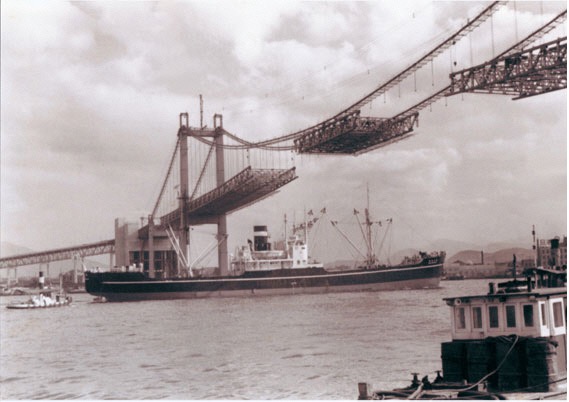 若戸大橋ができる前は、若松・戸畑間を直接つなぐ交通手段は船しかありませんでした。船以外の交通手段、すなわち橋やトンネルを求める機運が高まったのは、1930(昭和5)年に起こった渡し船の転覆事故がきっかけ。戦争で一旦は頓挫したものの、その後の高度経済成長期に車の利用が大幅に増えたことでさらに必要性が高まり、若戸大橋の建設は始まりました。